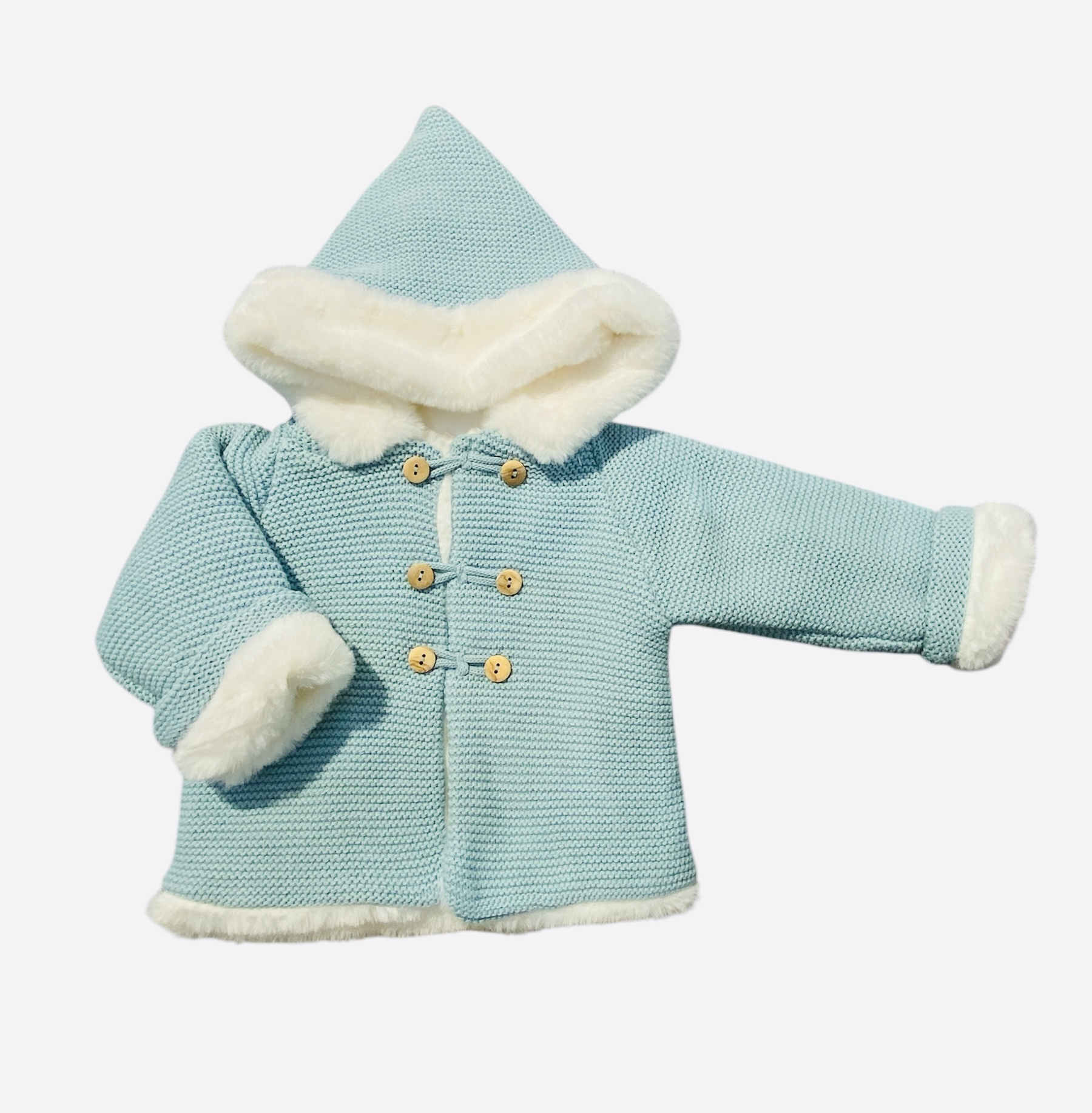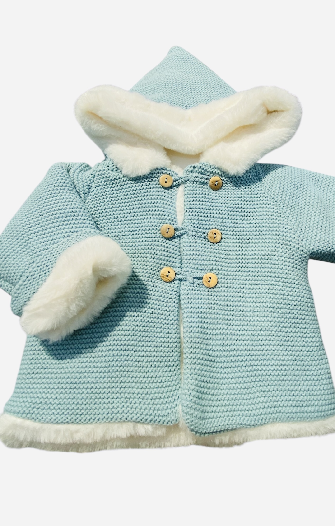 abrigo tipo trenka con capucha , en punto tono verde mar con interior forrado de pelito , apertura delantera. totalmente unisex.
