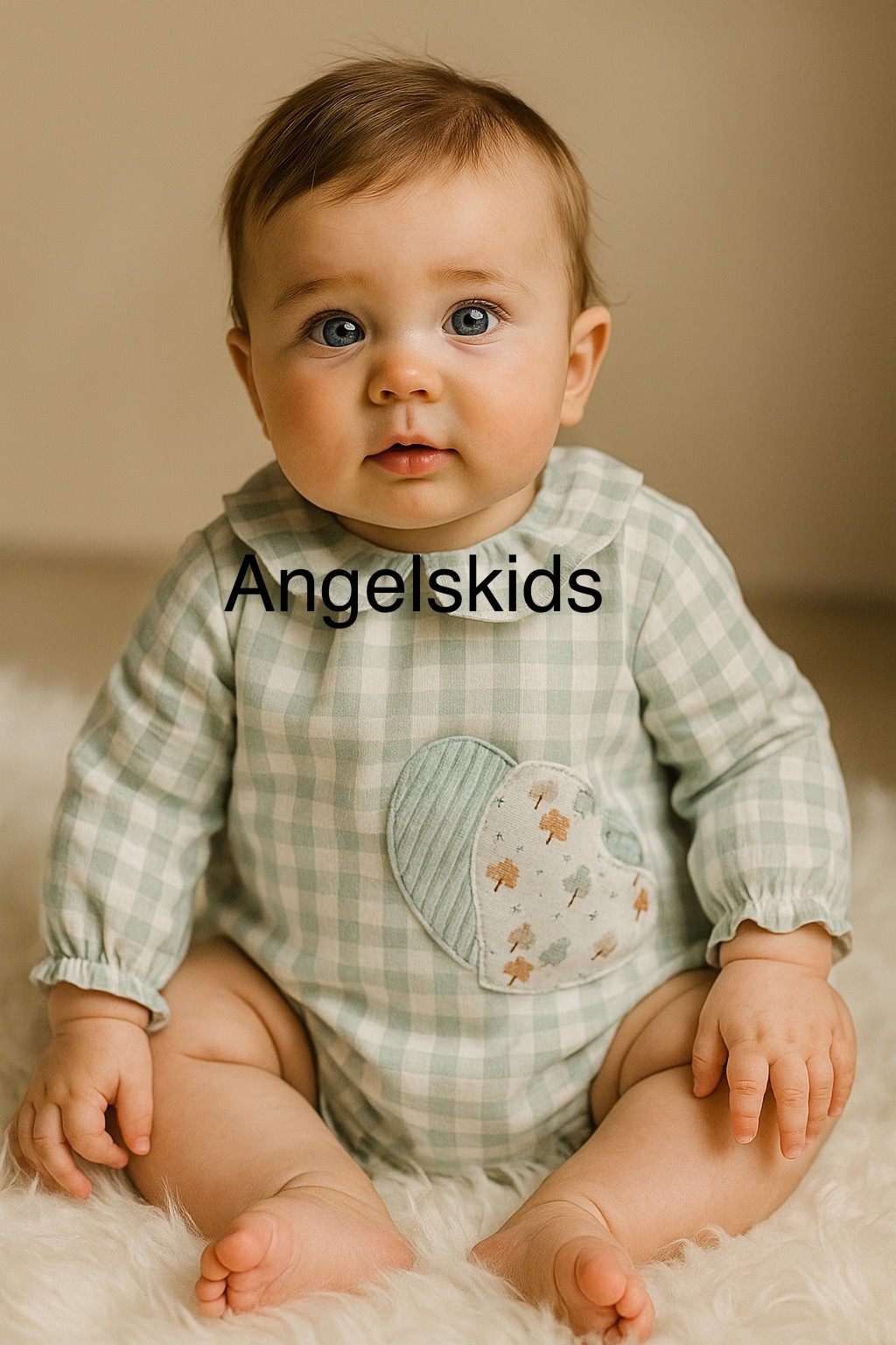 pelele en tejido vichi suave verde empolvado , con detalle de bordado en frontal en relieve , cuello volante , botones en bajo y espalda , totalmente unisex.
