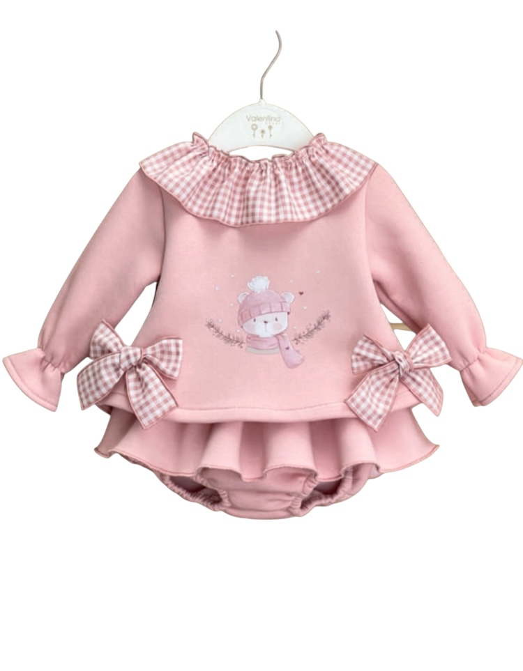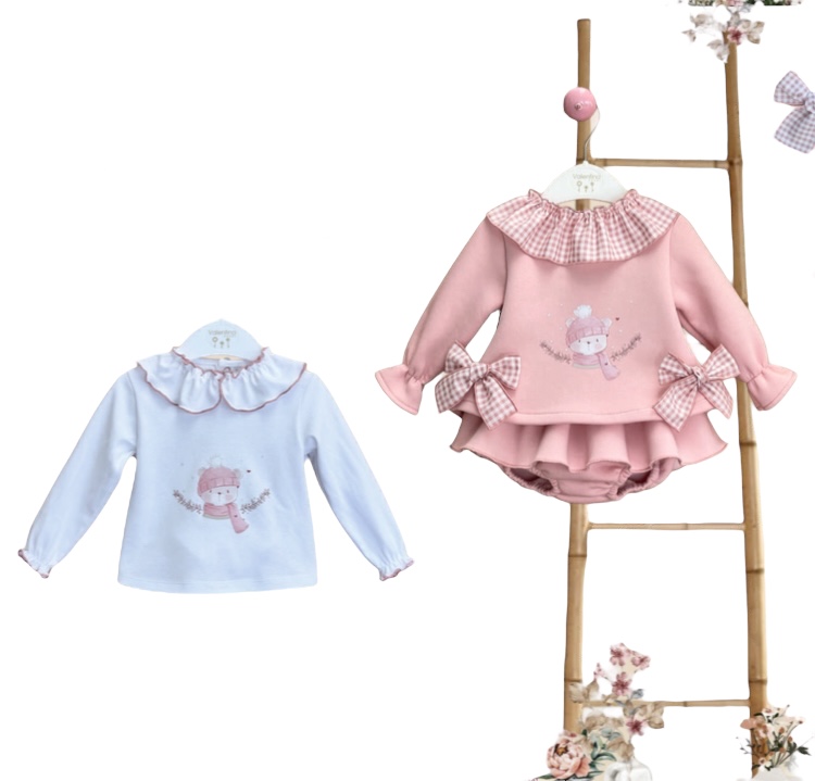 conjunto de sudadera en algodon felpado tono rosa empolvado, con cuello volante fruncido en tejido vichi al tono , lazadas a los lados en tejido , botones en espalda apertura total hasta talla 18meses , a partir de talla 24meses botones en espalda altos . camiseta manga larga en algodon blanco felpado, con dibujo en frontal serigrafiado, cuello y puños rematado en hilo al tono, botones en espalda, braguitas con volante en algodon felpado,