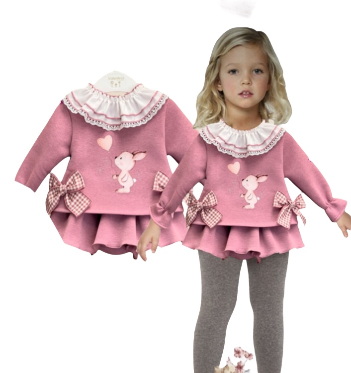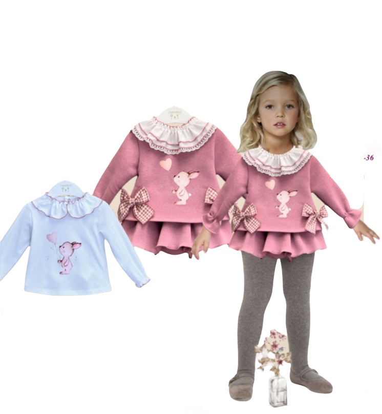conjunto de sudadera en algodon felpado tono rosa fresa , con cuello volante fruncido en tejido rematado con puntilla , lazadas a los lados en tejido , botones en espalda apertura total hasta talla 18meses , a partir de talla 24meses botones en espalda altos . camiseta manga larga en algodon blanco felpado, con dibujo en frontal serigrafiado, cuello y puños rematado en hilo al tono, botones en espalda, braguitas con volante en algodon felpado al mismo tono.