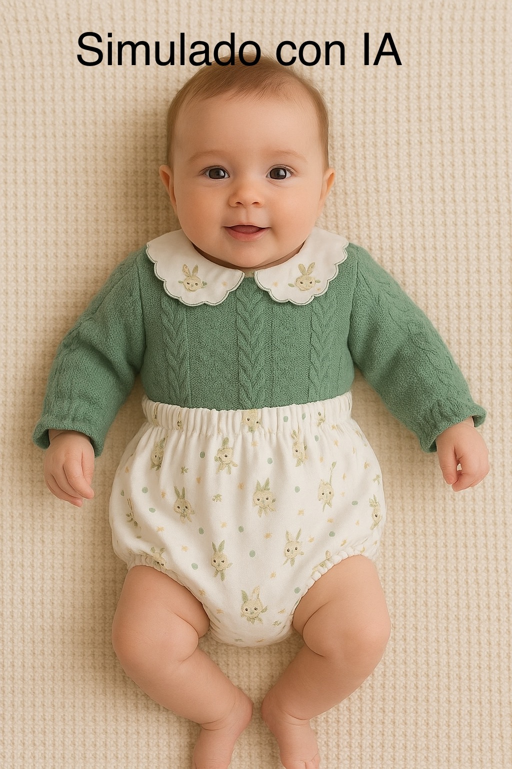 conjunto de jersey en punto trenzado tono verde hoja con cuello en tejido ,, botones en espalda apertura total, ranita en tejido estampado al tono cintura engomada , interior forrado, conjunto totalmente unisex . 100% algodon .