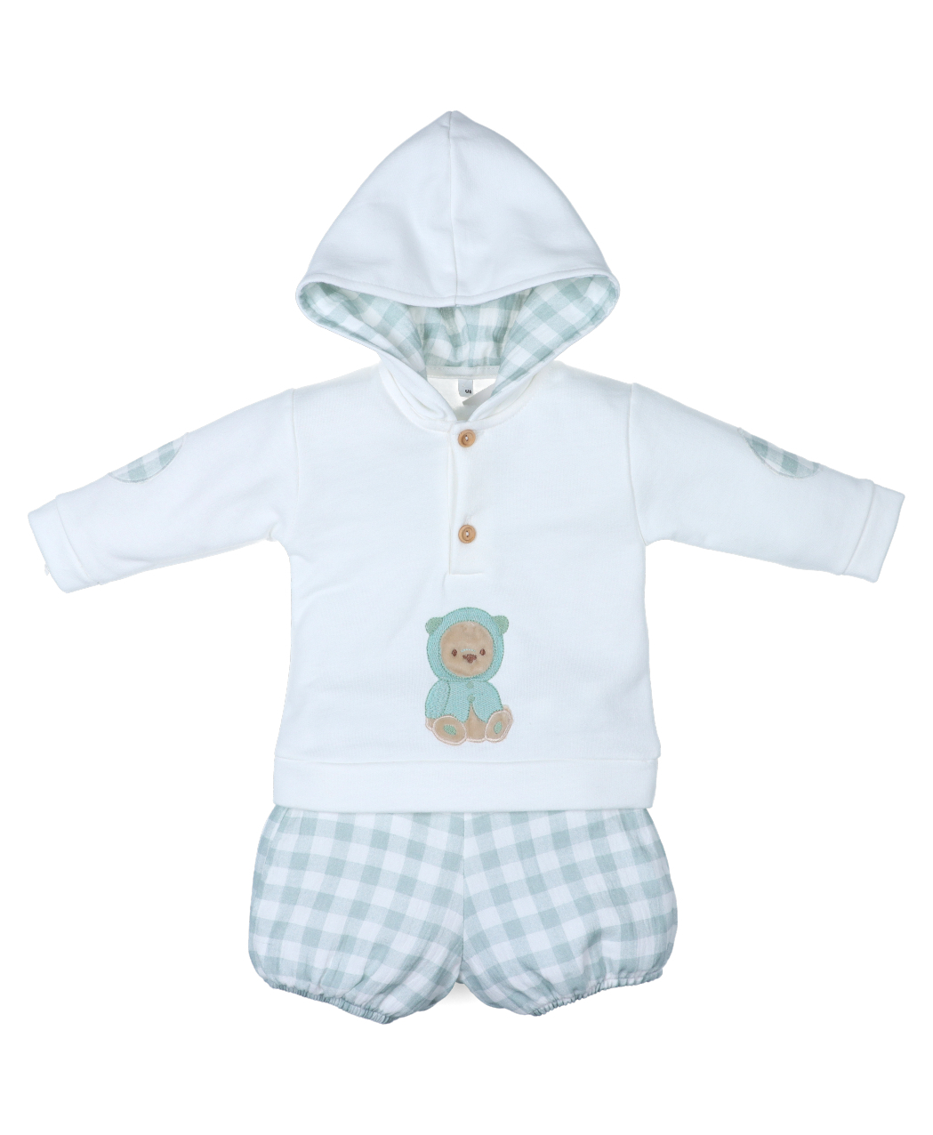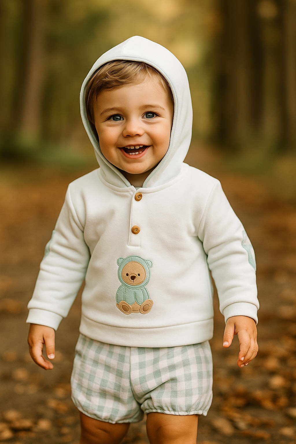 conjunto de sudadera en algodon felpado tono blanco con capucha interior forrado en tejido vichi tono verde empolvado, detalle de coderas y dibujo en frontal bordado en relieve, botones delanteros , pantalon bombachito en tejido muselina en vichi verde empolvado , interior forrado, perneras y cintura trasera engomada. totalmente unisex.