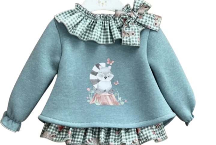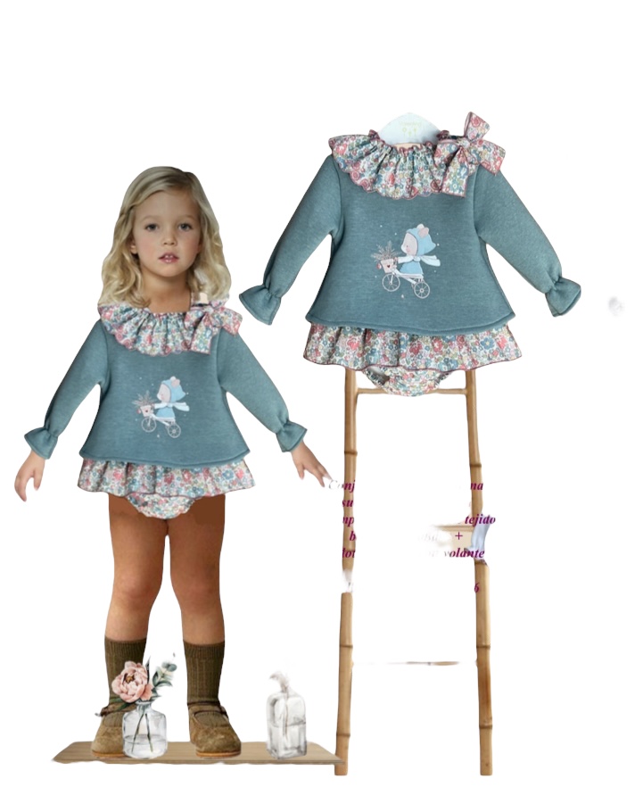 conjunto de sudadera en algodon felpado tono verde empolvado con cuello volante en tejido y lazada , detalle de dibujo serigrafiado alta calidad en frontal botones en espalda apertura total hasta talla 18mese , a partir de talla 24meses botones en espalda altos . braguita con volante en tejido estampado floral al tono , cintura engomada .