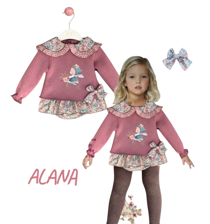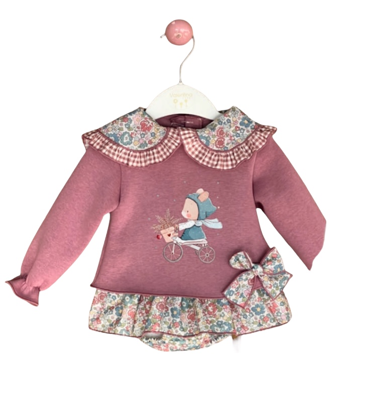 conjunto de sudadera en algodon felpado tono morado con cuello bebe rematado en volantillo , detalle de dibujo serigrafiado alta calidad en frontal, lazada en bajo en tejido estampado , botones en espalda apertura total hasta talla 18mese , a partir de talla 24meses botones en espalda altos . braguita con volante en tejido estampado floral al tono , cintura engomada .