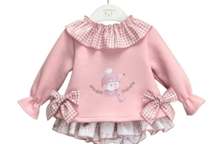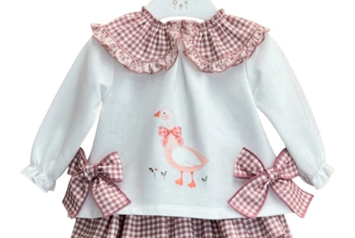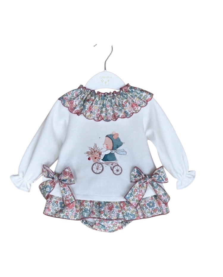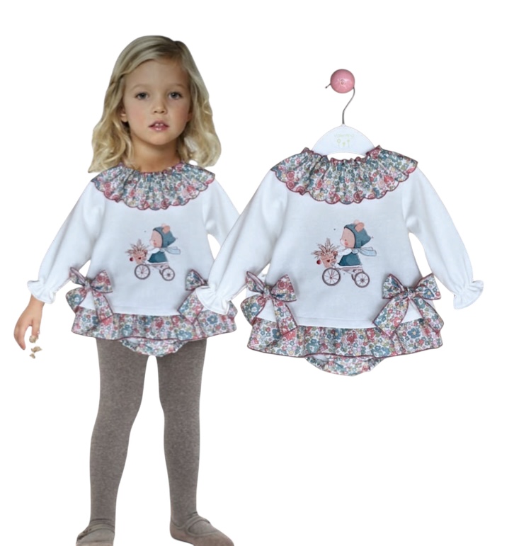 conjunto de sudadera en algodon felpado tono blanco con cuello volante en tejido , lazada a los lados en tejido estampado floral, detalle de dibujo serigrafiado alta calidad en frontal botones en espalda apertura total hasta talla 18mese , a partir de talla 24meses botones en espalda altos . braguita con volante en tejido estampado floral al tono , cintura engomada .