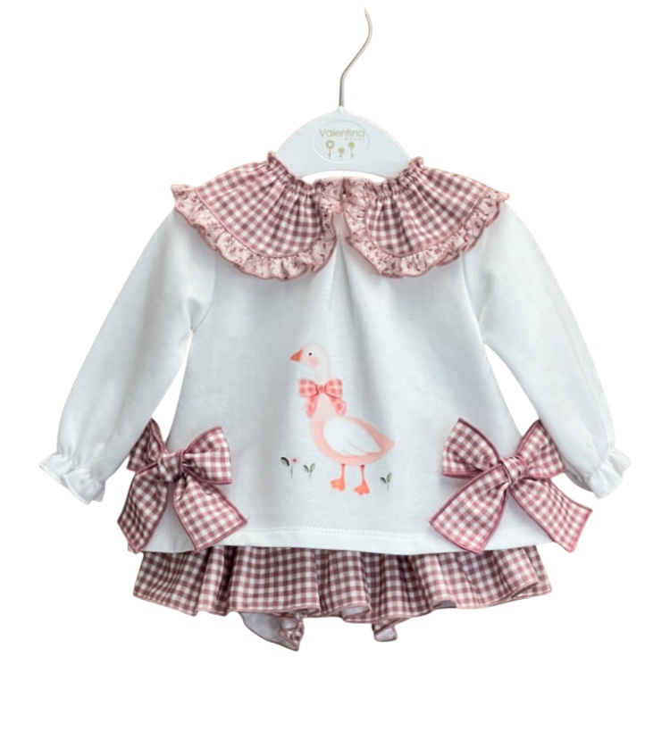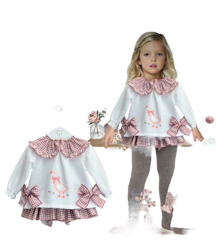 conjunto de sudadera en algodon felpado tono blanco con cuello en vichi rematado volantillo , lazada a los lados en vichi , detalle de dibujo serigrafiado alta calidad en frontal botones en espalda apertura total hasta talla 18mese , a partir de talla 24meses botones en espalda altos . braguita con volante en tejido vichi tono morado , cintura engomada .