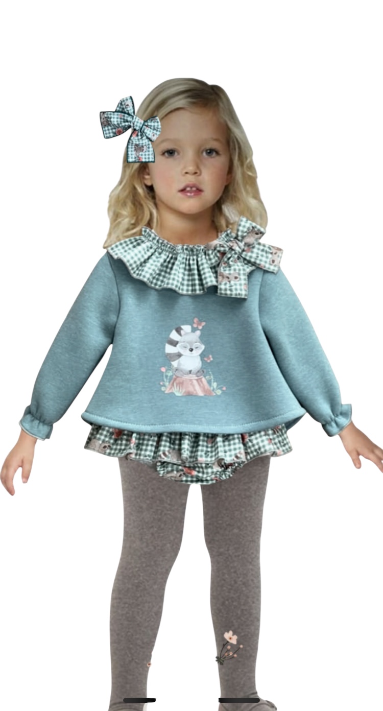 conjunto de sudadera en algodon felpado tono verde empolvado con cuello volante en tejido vichi, con lazada al tono , detalle de dibujo serigrafiado alta calidad en frontal botones en espalda apertura total hasta talla 18mese , a partir de talla 24meses botones en espalda altos . braguita con volante en tejido vichi estampado al tono, cintura engomada .