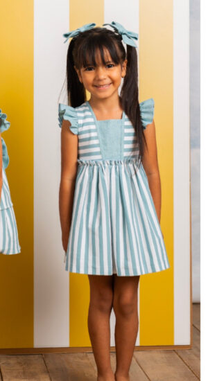camiseta manga corta engomada en algodon amarillo con volantillo en bajo y cuello en tejido vichi al tono , detalle de dibujo bordado en relieve en frontal apertura total con botones en espalda. culotte con volantes en tejido vichi al tono .