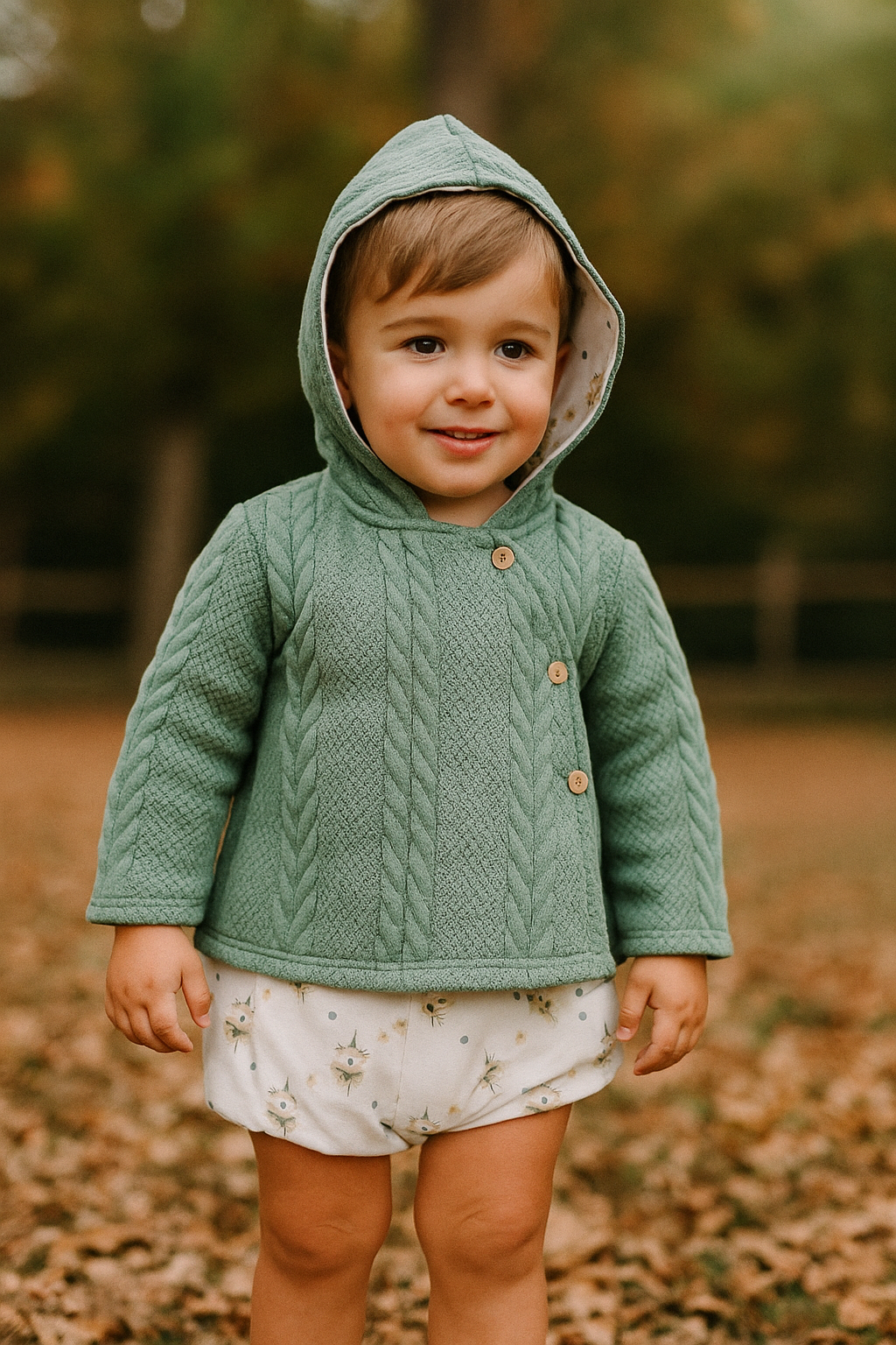 conjunto de jersey con capucha en punto trenzado tono verde hoja con apertura total con botones delanteros laterales ,pantalon bombachito en tejido estampado al tono , perneras y cintura engomadas, interior forrado, conjunto totalmente unisex . 100% algodon .