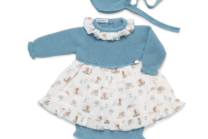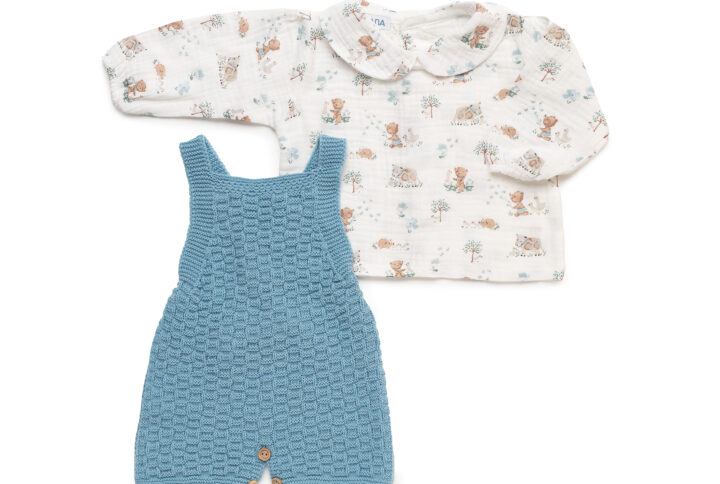 petito tirantes corto en punto tono azul nube , camisa en bambula estampada manga larga con cuello bebe , botones en espalda apertura total . conjunto totalmente unisex .