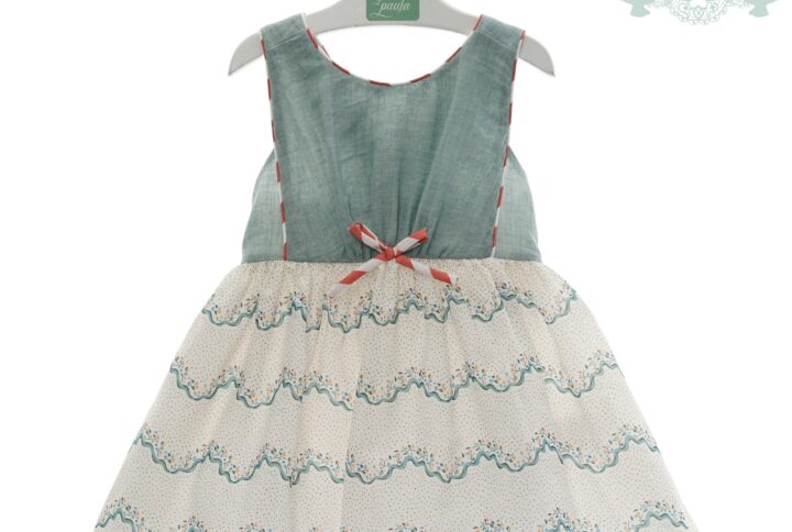 conjunto de camisa manga corta tipo lino blanco , cuello bebe con pequeña pajarita, y detalle de solapas de chaleco en verde empolvado, botones en espalda apertura total, bombachito en tono verde empolvado , cintura trasera engomada.