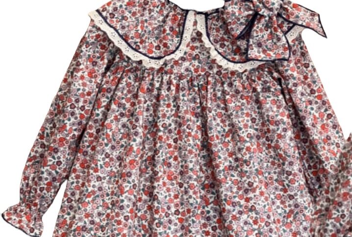 sudadera en algodon felpado tono caldera con detalle de cuello babero en tejido estampado al tono , botones en espalda tipo snap apertura total, braguita con volante en tejido estampado , cintura engomada.
