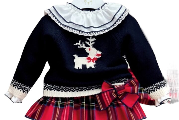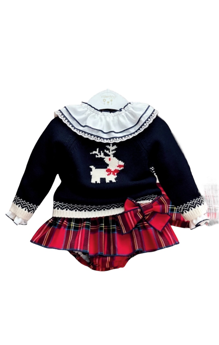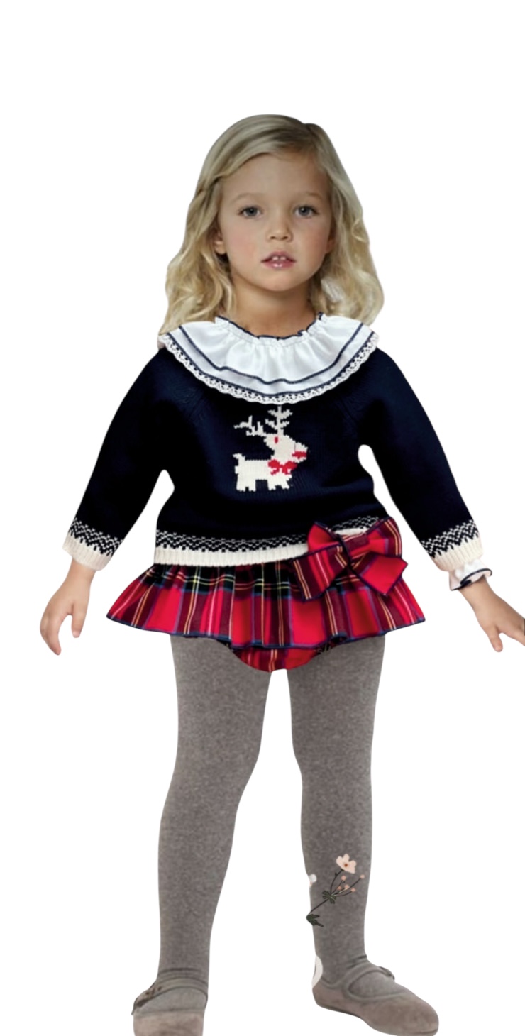conjunto de jersey en punto tono azul marino con detalle de dibujo en greca en frontal ,  puños y bajo rematado con grecas , botones en espalda apertura total hasta talla 18meses , a partir de talla 24meses botones en espalda altos, culotte en tejido tartar rojo con volante y lazada en cintura , perneras y cintura entomadas , interior forrado, blusa blanca manga larga con cuello volante rematado en puntilla ,puños engomados y rematados en hilo al tono, botones en espalda apertura total.