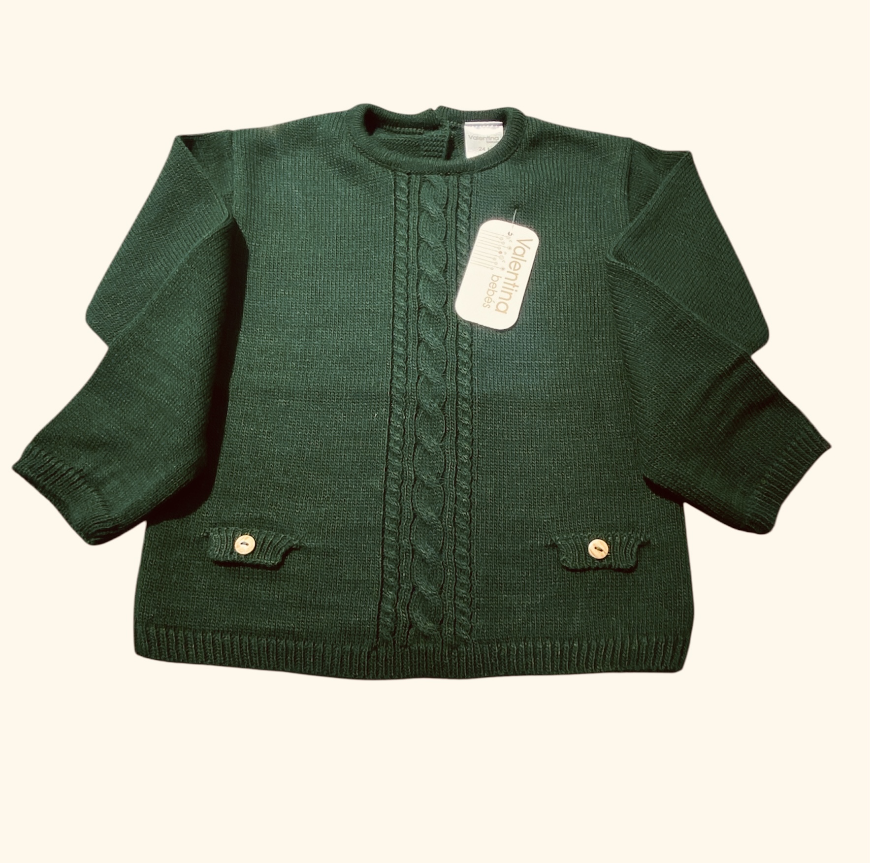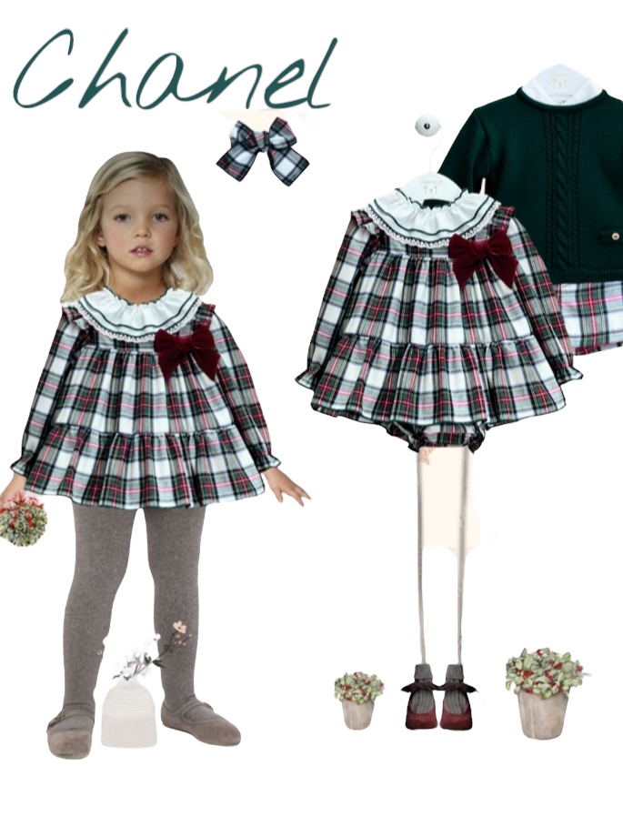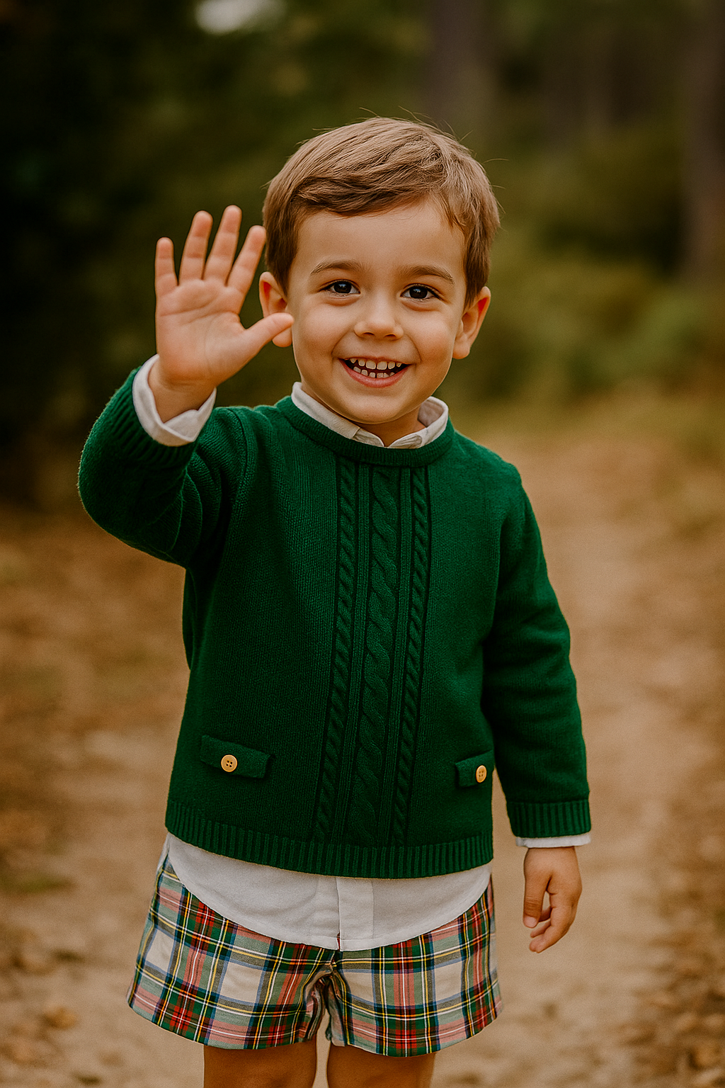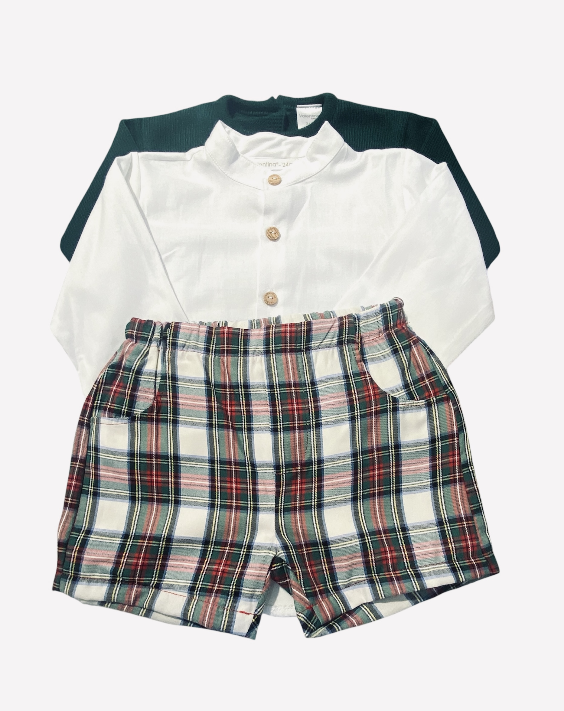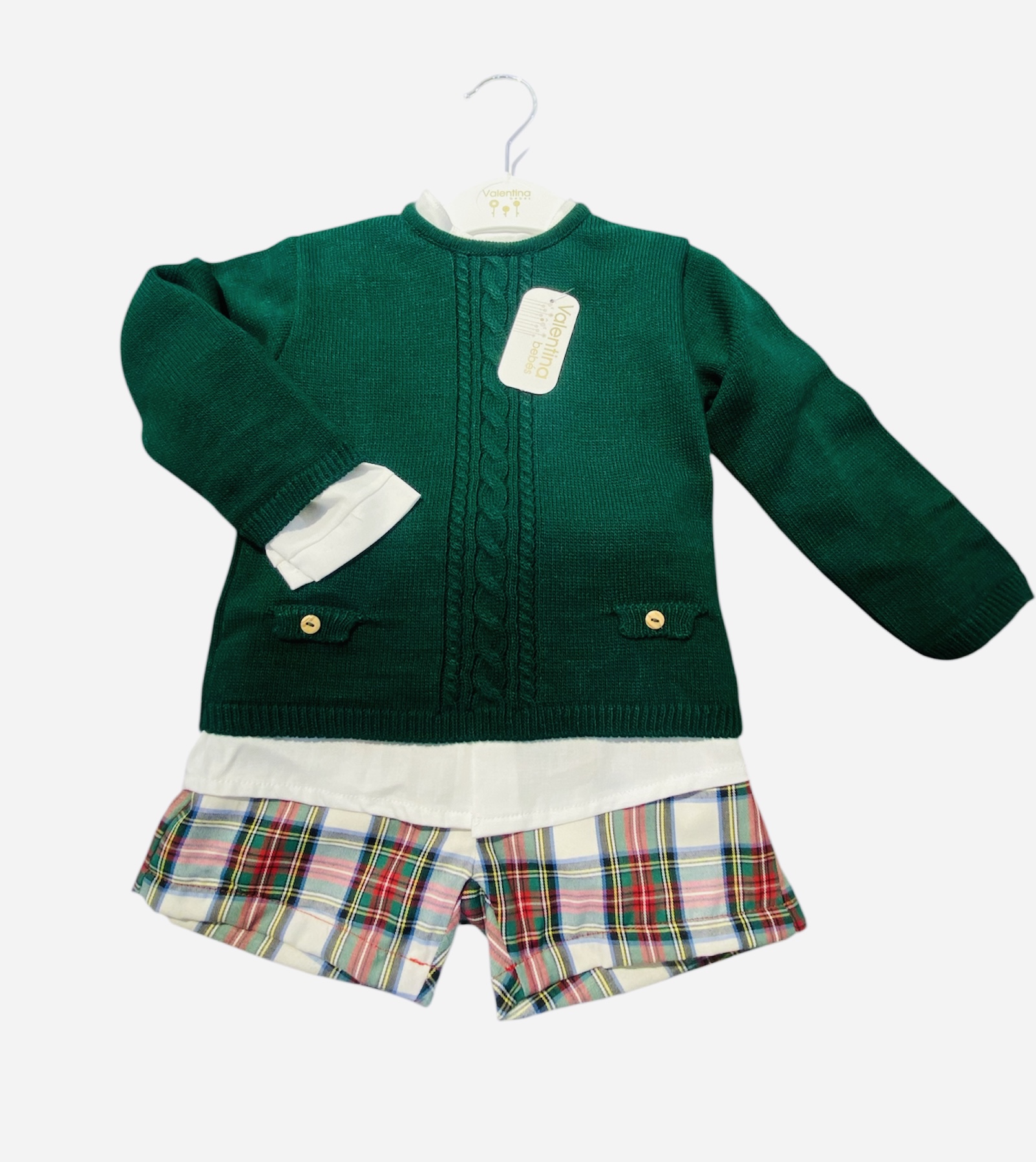 conjunto de tres piezas , pantalon en tejido tartan ingles con cintura engomada, interior forrado , tipo bombachito hasta talla 18meses, a partir de talla 24meses pantalon corto recto, camisa manga larga blanca  con cuello mao , botones delanteros apertura total, jersey en punto tono verde ingles  con detalle de punto en nudos delanteros ,  botones en espalda.