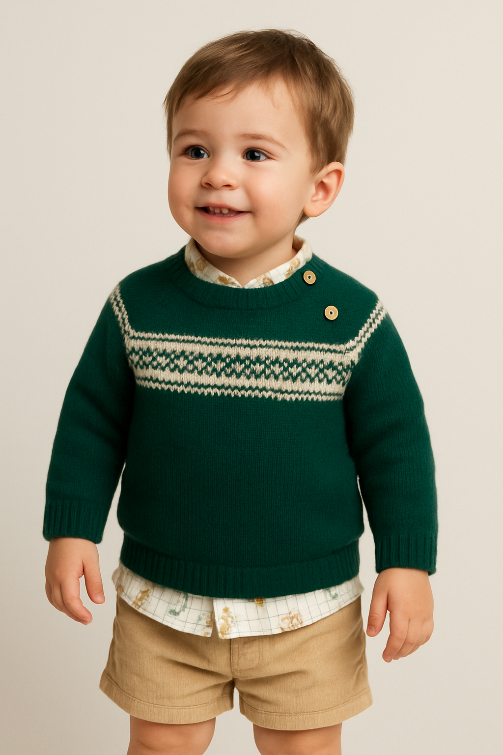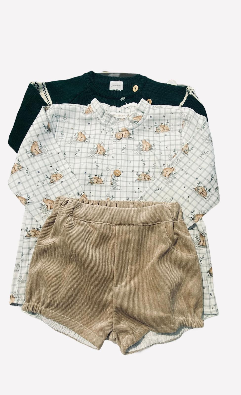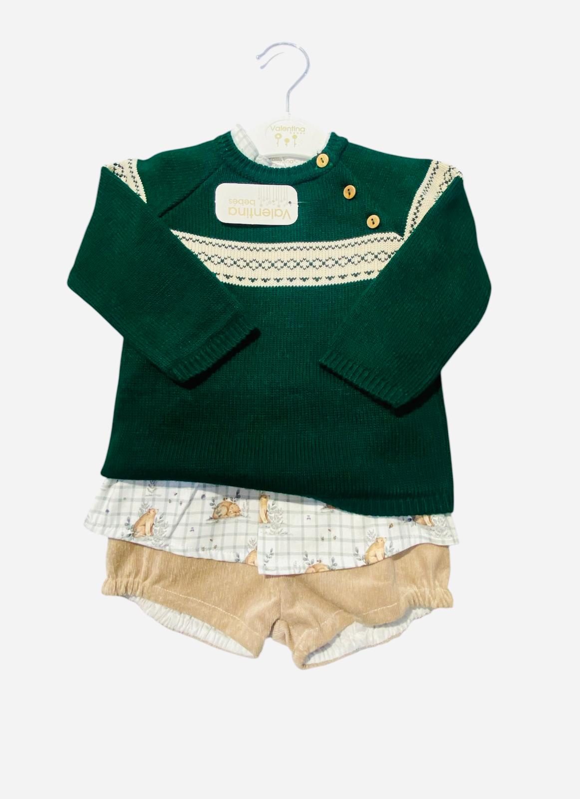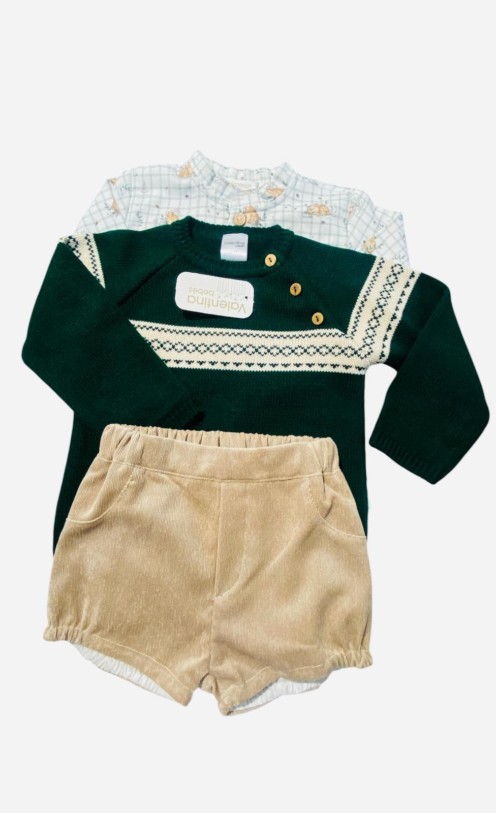 conjunto de jersey en punto tono verde botella con detalle de grecas en crudo , camisa manga larga en tejido estampado al tono , con cuello mao , botones delanteros , pantalon en micropana tono tostado , interior forrado , tipo bombachito hasta talla 18meses , a partir de talla 24meses pantalon corto recto.