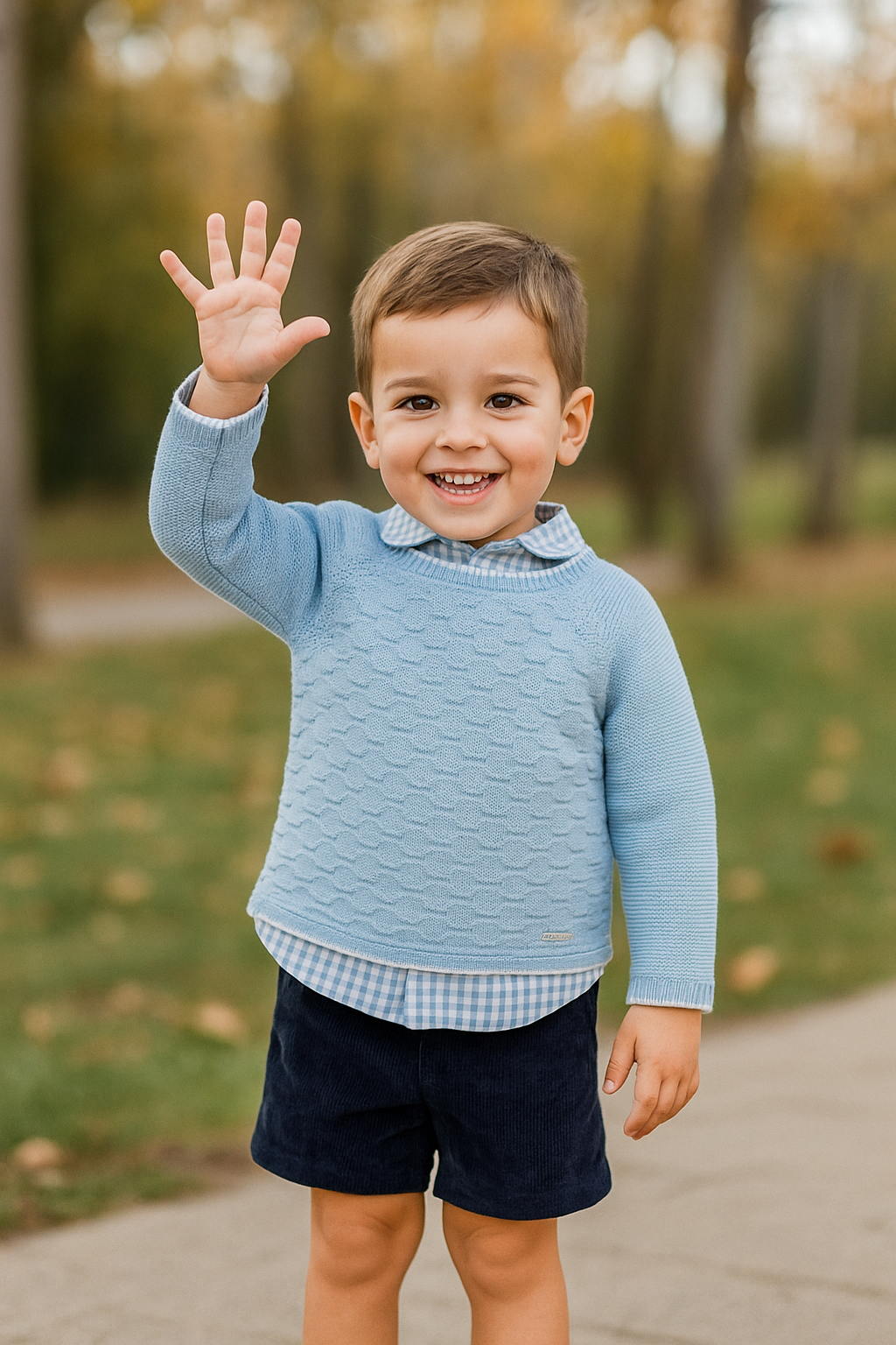 conjunto de jersey en punto tono azul empolvado , detalle de punto en rombos delanteros , botones en espalda apertura total hasta talla 18meses a partir de talla 24meses botones traseros altos, pantalon en micropana tono azul marino , interior forrado , tipo bombachito hasta talla 18meses , a partir de talla 24meses pantalon corto recto, camisa en tejido vichi al tono , manga larga con cuello mao , botones delanteros apertura total,
