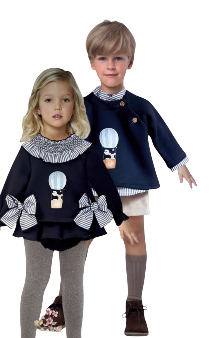 conjunto de sudadera algodon felpado tono azul marino con detalle de dibujo en frontal botones en parte delantera alta , camisa manga larga en tejido rayas al tono con cuello mao , botones delanteros , pantalon en micropana tono tostado , interior forrado , tipo bombachito hasta talla 18meses , a partir de talla 24meses pantalon corto recto.