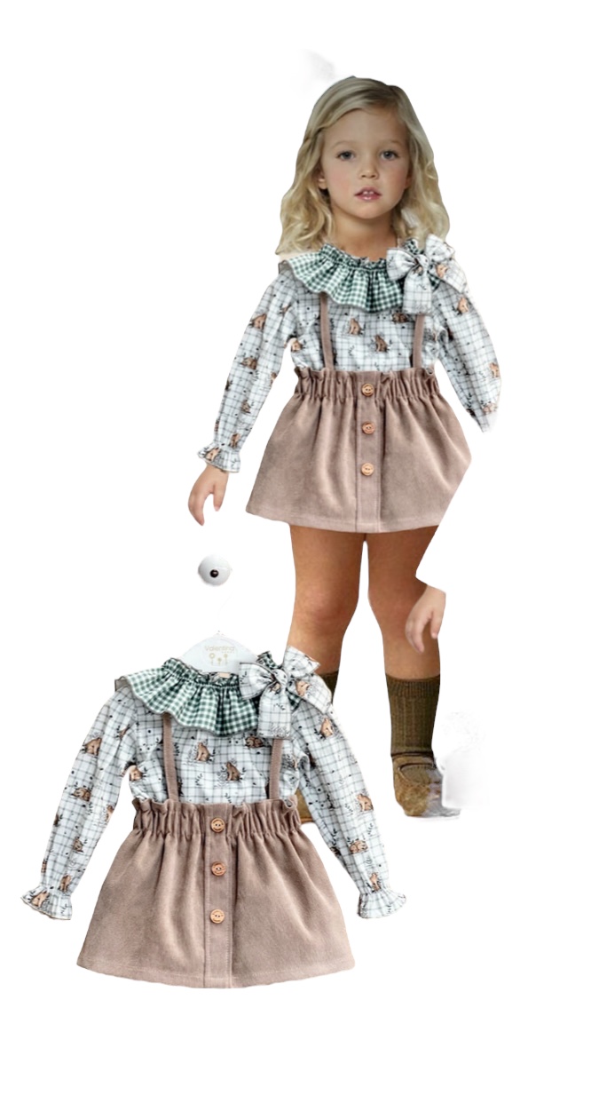 falda en suave  micropana tono arena con cintura engomada , falsos botones delanteros , tirantes ajustables en altura , braguita en micropana , blusa en tejido vichi estampado tonos verde empolvado con cuello volante en vichi  y lazada , puños rematados .