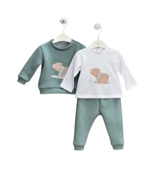 vestido en algodon felpado tono verde empolvado con doble cuello en tejido combinado estampado y vichi al tono y lazada , detalle de dibujo en frontal bordado , botones tipo snap en espalda apertura total. braguita en tejido bambula estampado .