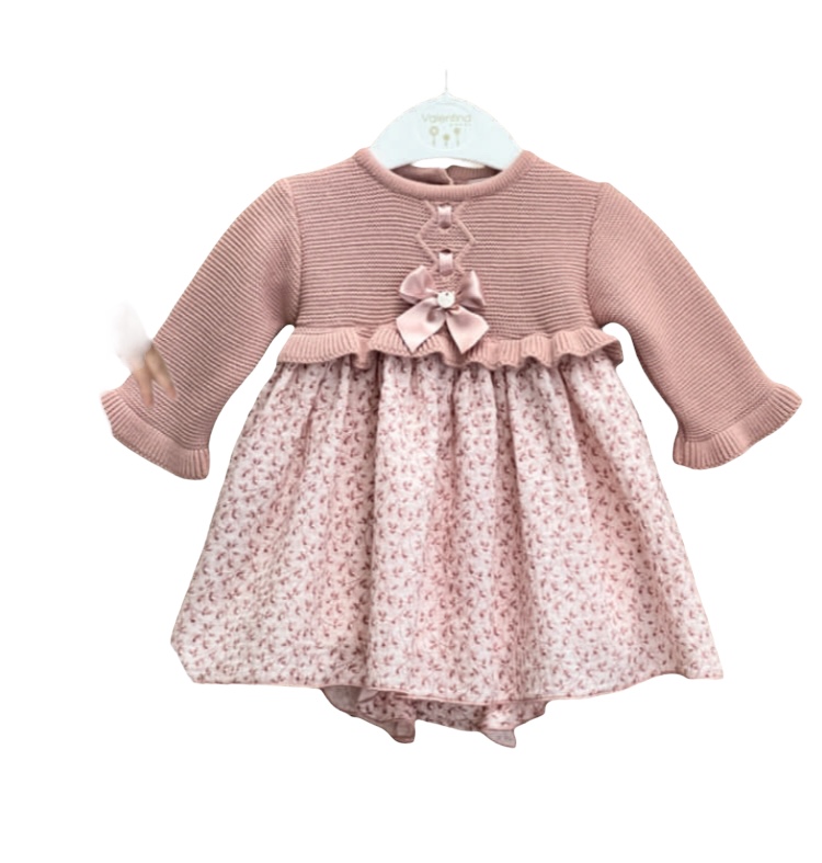 vestido con cuerpo de punto en tono rosa palo , con pasacinta al tono en pecherin, falda en tejido tipo bambula estampada al tono , con braguitas en misma tela , interio forrado , cierre en espalda con botones apertura total.