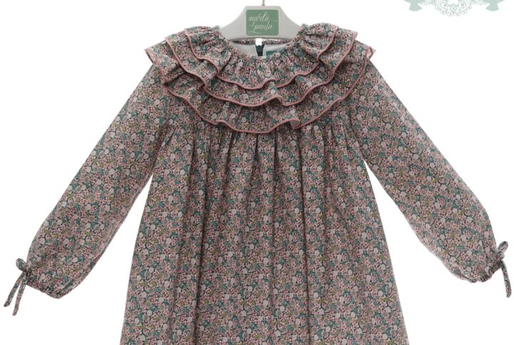 vestido corte jesusito en tejido estampado floral tonos rosa empolvado con detalle de crocht en tono verde turquesa en pecherin , interior forrado , braguita y capota incluidas.