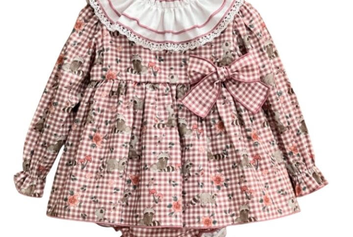 vestido corte jesusito en tejido tartan rojo con cuello volante con detalle de nido , interior forrado , braguita y capota a juego incluida.