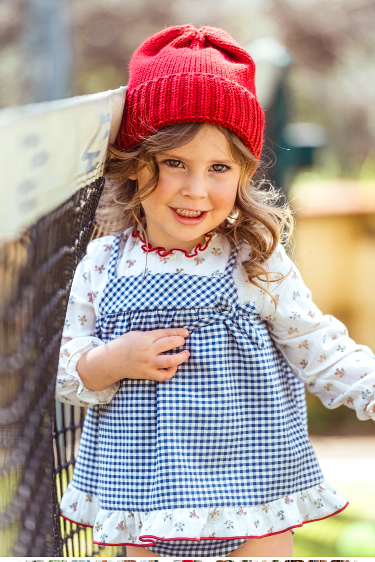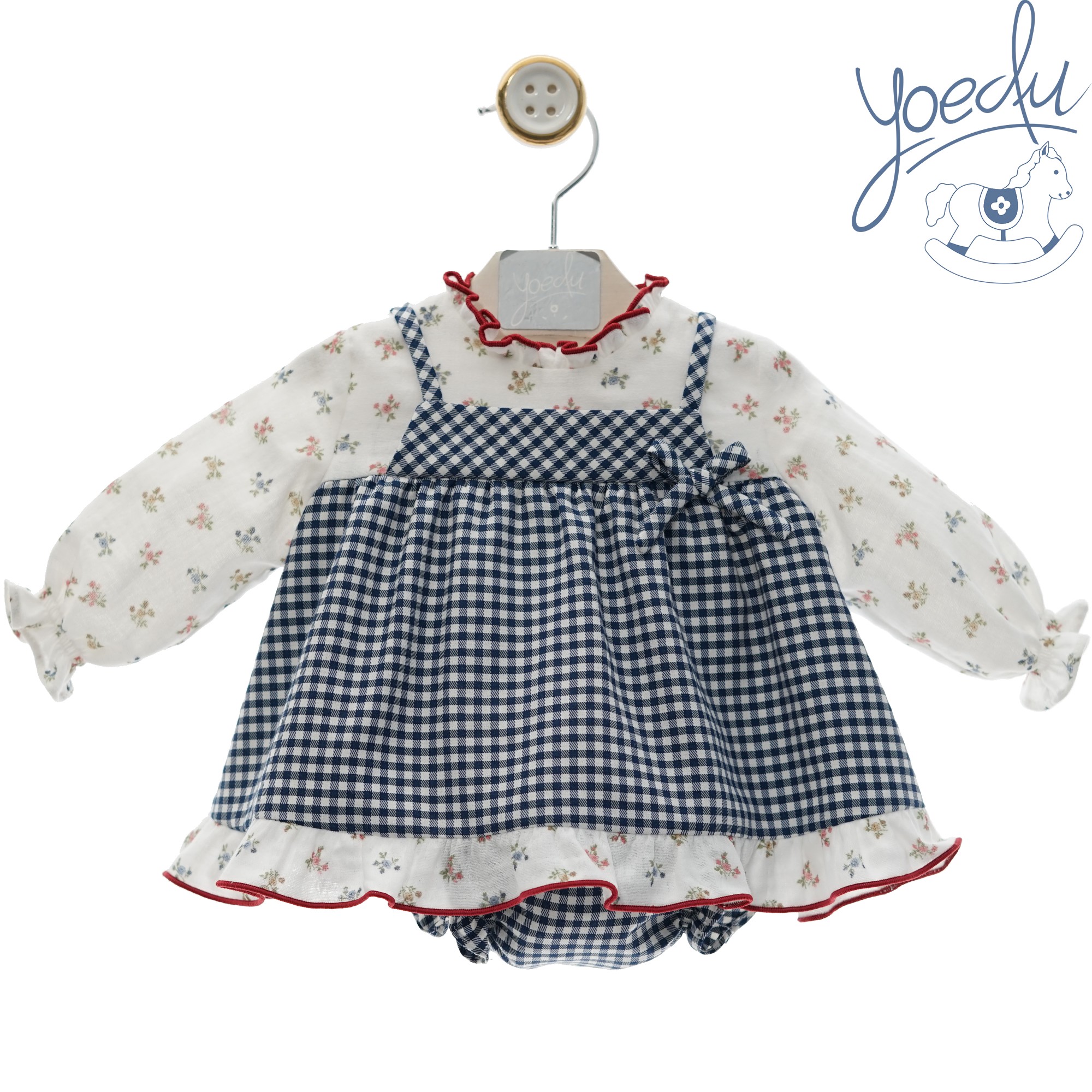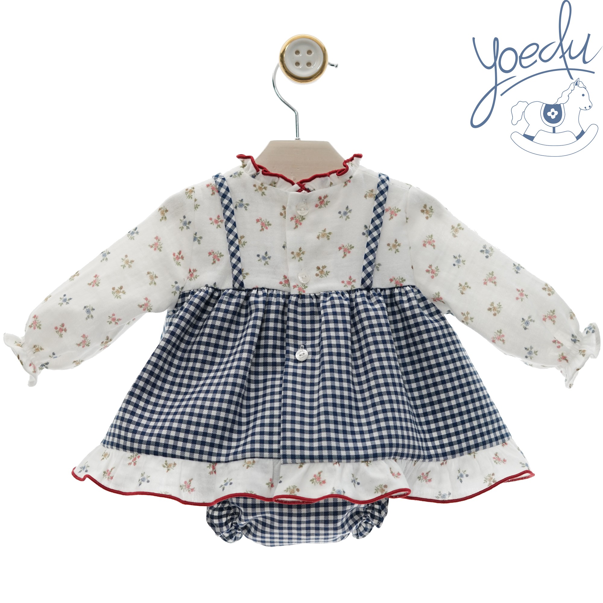 vestido corte jesusin con braguitas , falda en tejido vichi con volantillo en bajo , pecherin en tejido estampado froral con cuello volantillo rematado , interior forrado , botones en espalda apertuta total.