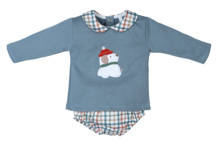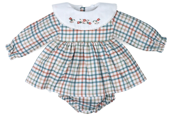ranita en punto canale con tirantes tono arena con botones en bajo , blusa en tejido bambula estampado, con cuello volante , botones en espalda apertura total,