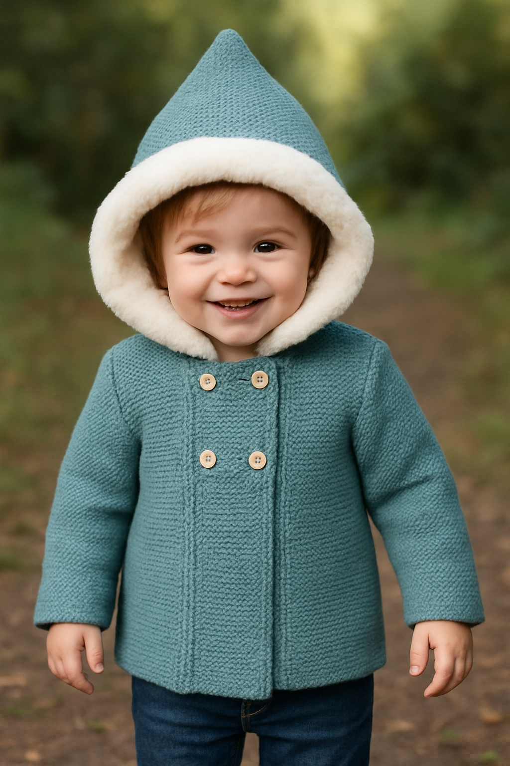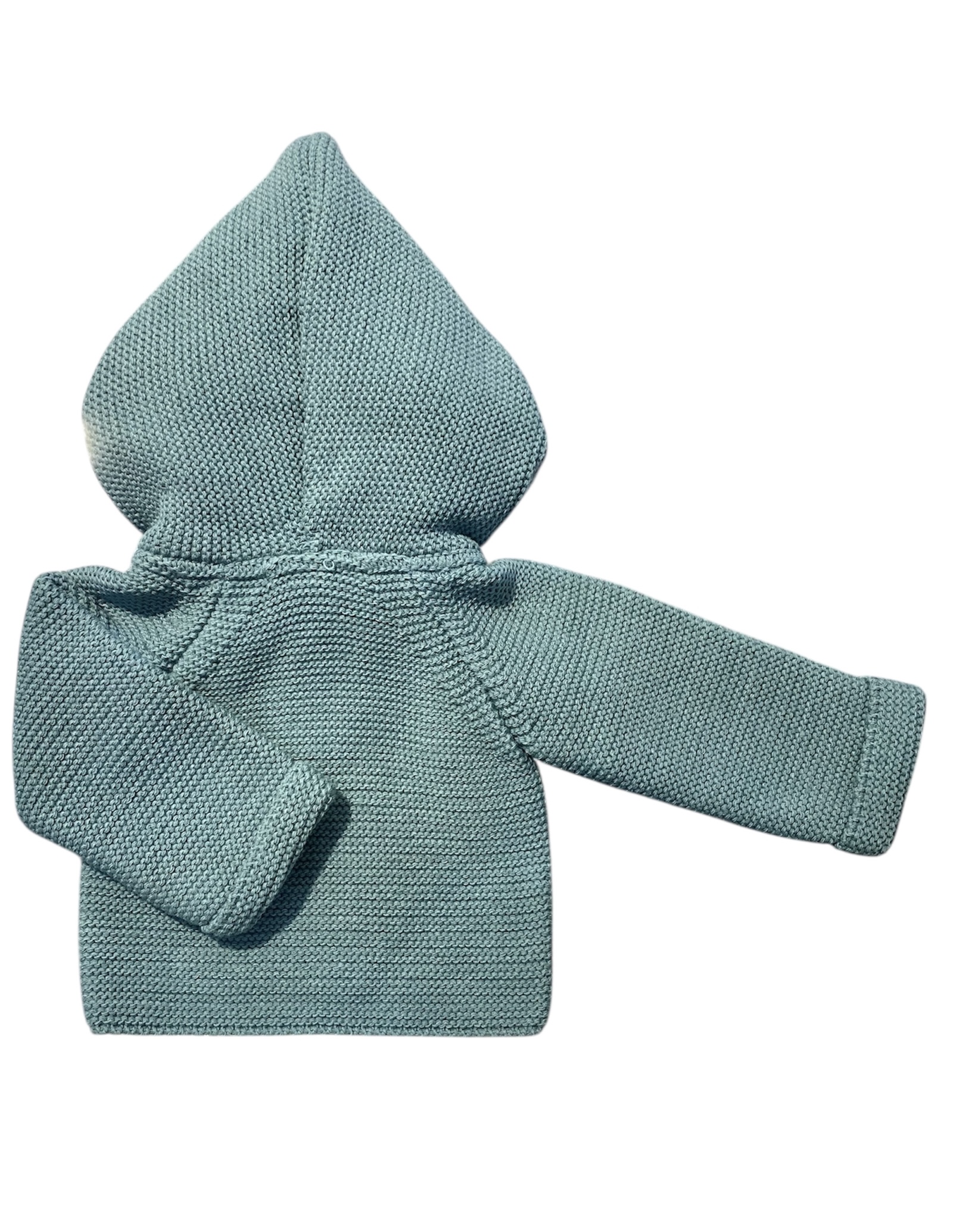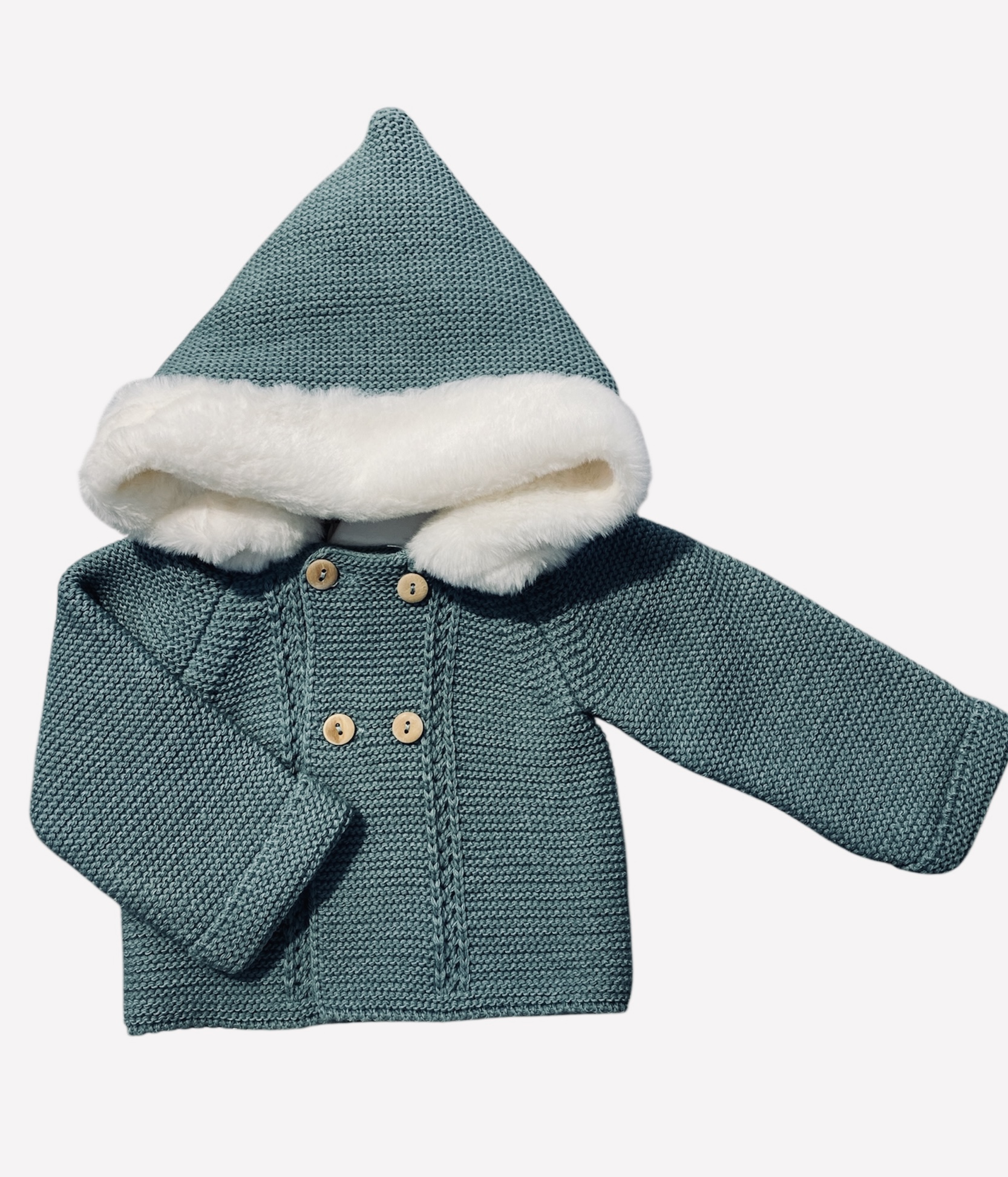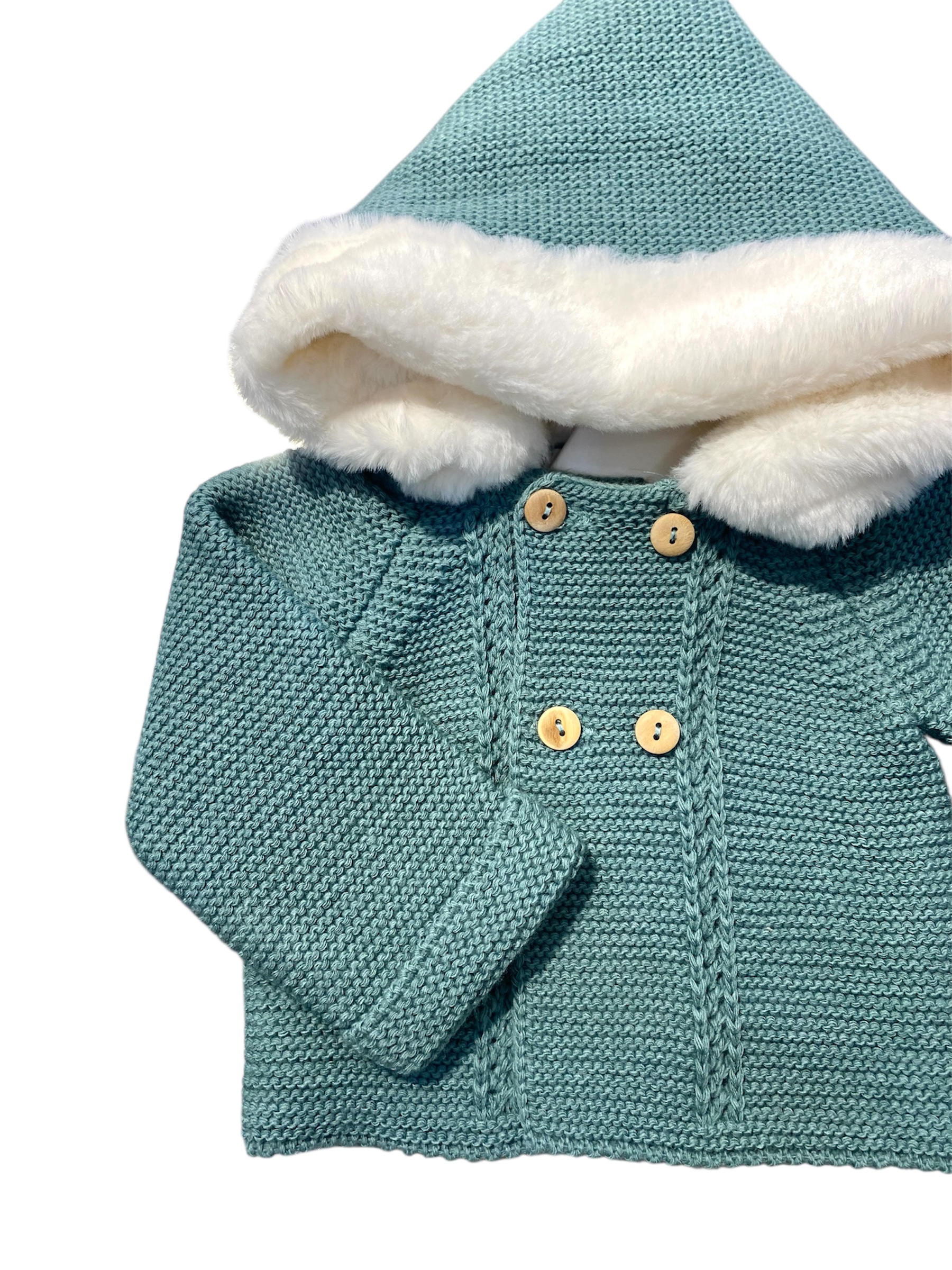 Rebeca en punto bobo tono verde hoja con doble botones y detalle de trenzado en frontal , capucha con interior forrado en suave pelito . totalmente unisex.
