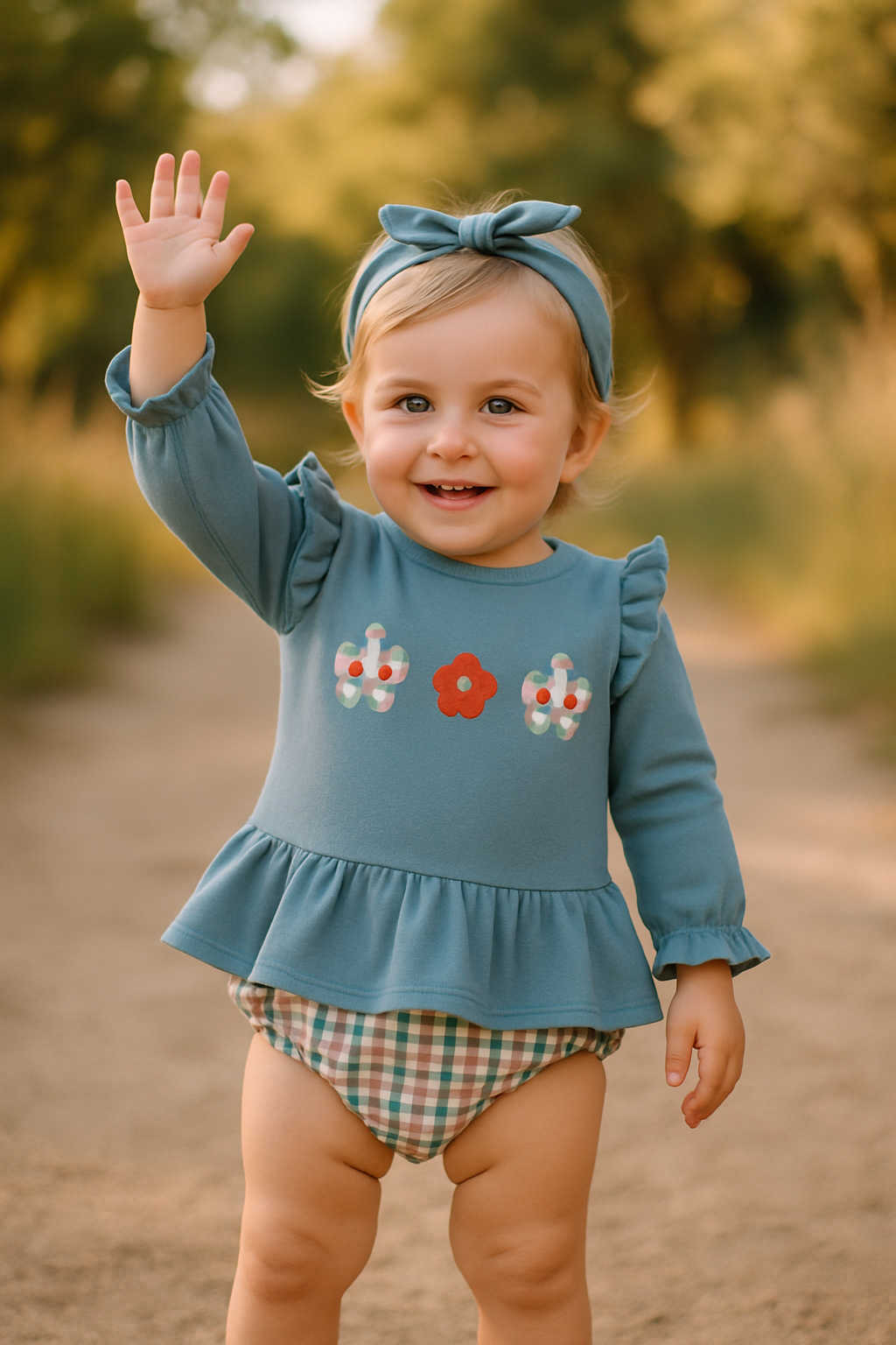 vestido en algodon felpado en tono azul bruma con volantillo en bajo y hombros , detalle de dibujo bordado en frontal y mangas engomadas , botones en espalda tipo snap apertuta total , braguita en tejido vichi al tono con cintura engomado de abeja y totalmente forrada.
