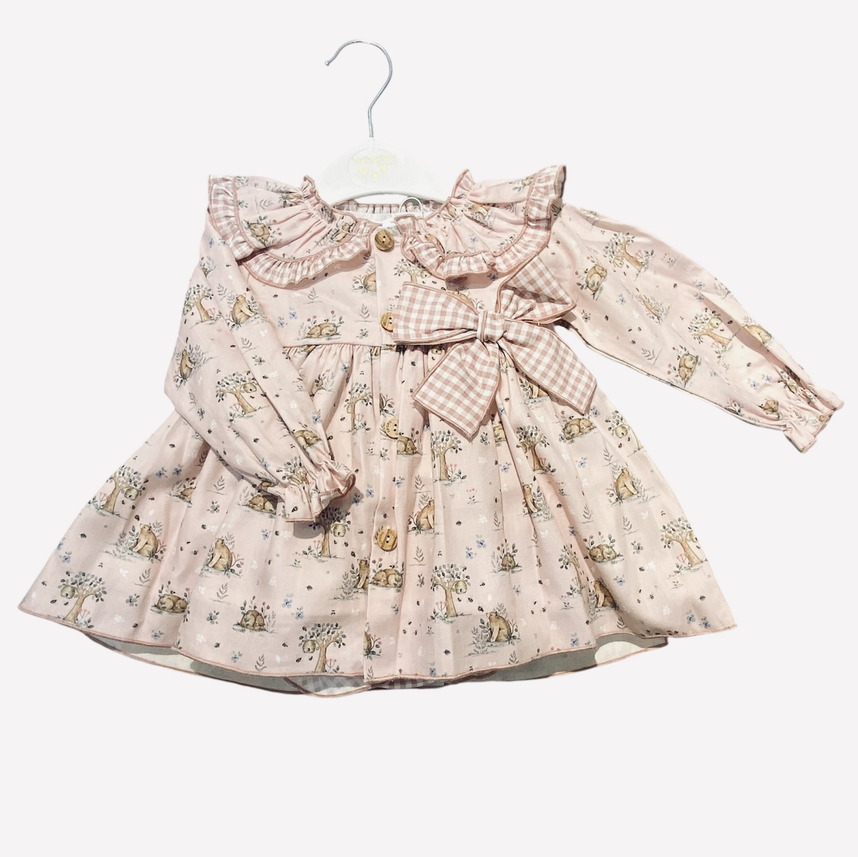 vestido en tejido estampado tono rosa empolvado con detalle de lazada en vichi al tono en pecherin , cuello con volantillo , interior totalmente forrado , botones en espalda apertura total , braguitas incluidas , en vichi al tono.