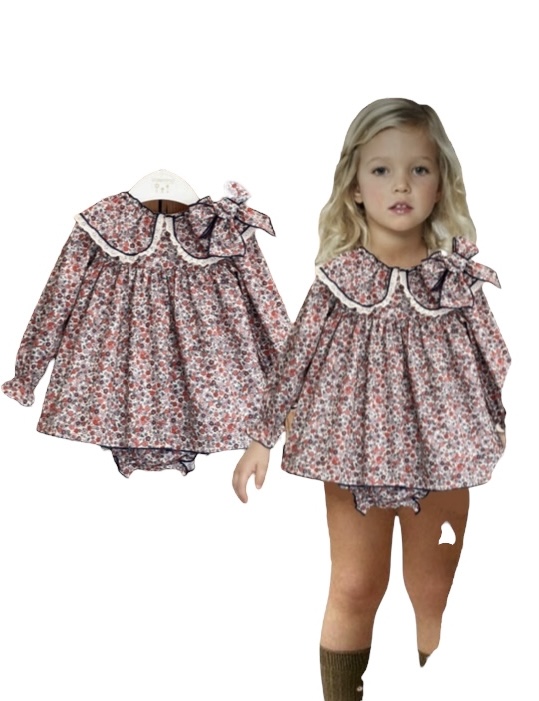 vestido en tejido estampado floral ,cuello bebe fruncido y rematado en puntilla , con lazada , interior forrado, botones en espalda apertura total. braguita incluida.