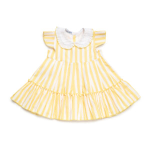 Este vestido super bonito de mangas cortas , con el cuerpo en hilo tono amarillo limon con cuello bebe en tejido rematado con volantillo , cierre trasero con botones en la parte alta de la espalda, su falda en tejido a rayas al tono termina con un volantillo , tiene forro interior .