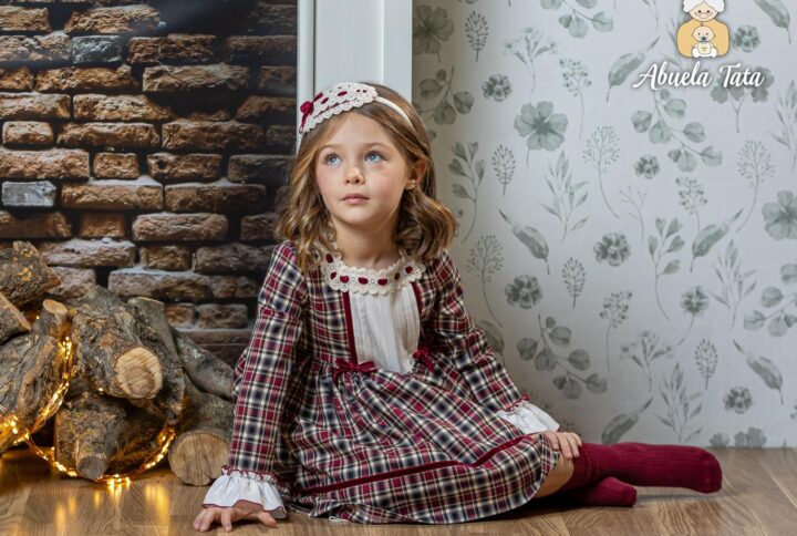 vestido vuelo en tejido cuadros tartan tonos burdeos con detalles en terciopelo al tono , cuello a la caja rematado en bolillo con pasacinta , volante en mangas , interior forrado totalmente , con enaguas , lazada trasera no desmontable en tul al tono , cierre con botones altos en espalda. .
