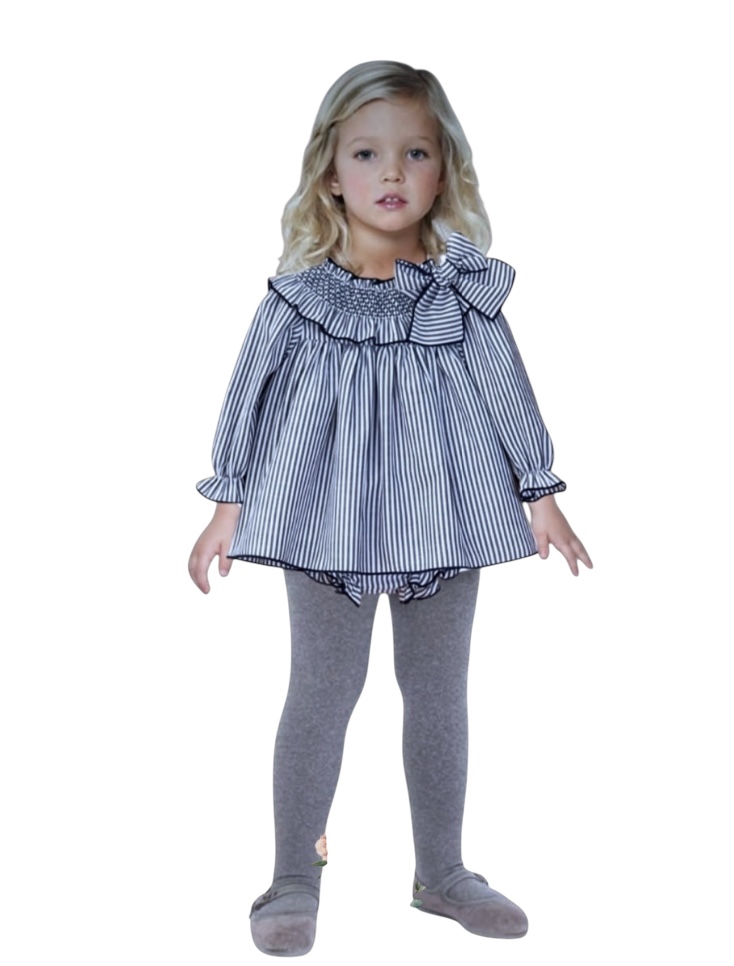 vestido en tejido a rayas tono azul marino , con detalle de cuello volante en nidos y lazada en tejido , mangas engomadas, interior forrado, braguitas a juego incluidas.