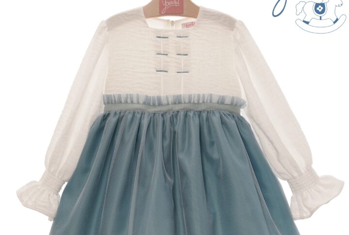 vestido vuelo con cuerpo en gasa de bambula blanca , cuello caja y engomado nidos en mangas, doble falda con tul en azul porcelana . cierre trasero con cremallera.