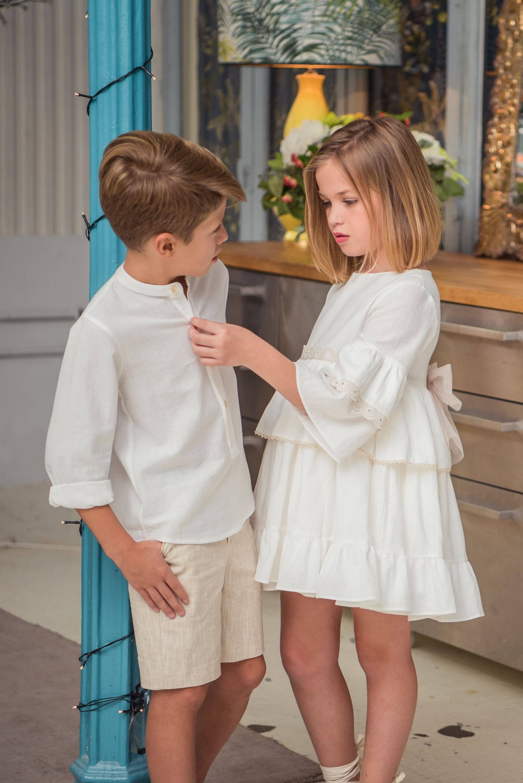 Vestido en lino grueso con manga francesa con volante , doble volante en falda , totalmente forrado , detalles en beig. lazada trasera en tul , cierre en cremallera.